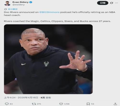 北京时间4月18日,刚刚卸任雄鹿主教练的道格-里弗斯宣布退休,正式离开NBA,结束长达27年的执教生涯。里弗斯常规赛执教战绩1194胜866负,胜场数排名历史第六,仅次于波波维奇、老尼尔森、威尔肯斯、杰里-斯隆和帕特-莱利。