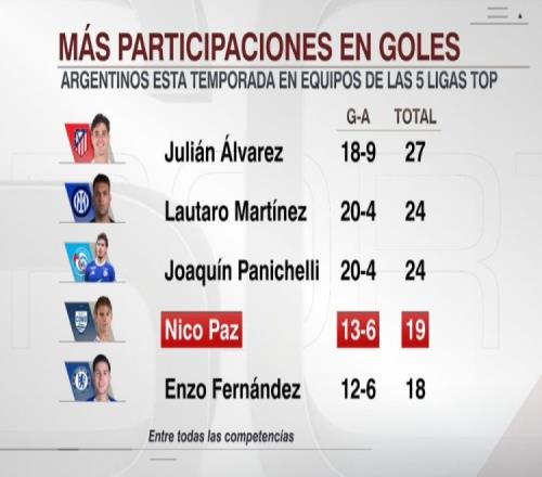 据ESPN统计,尼科·帕斯是本赛季参与进球第四多的五大联赛阿根廷球员。